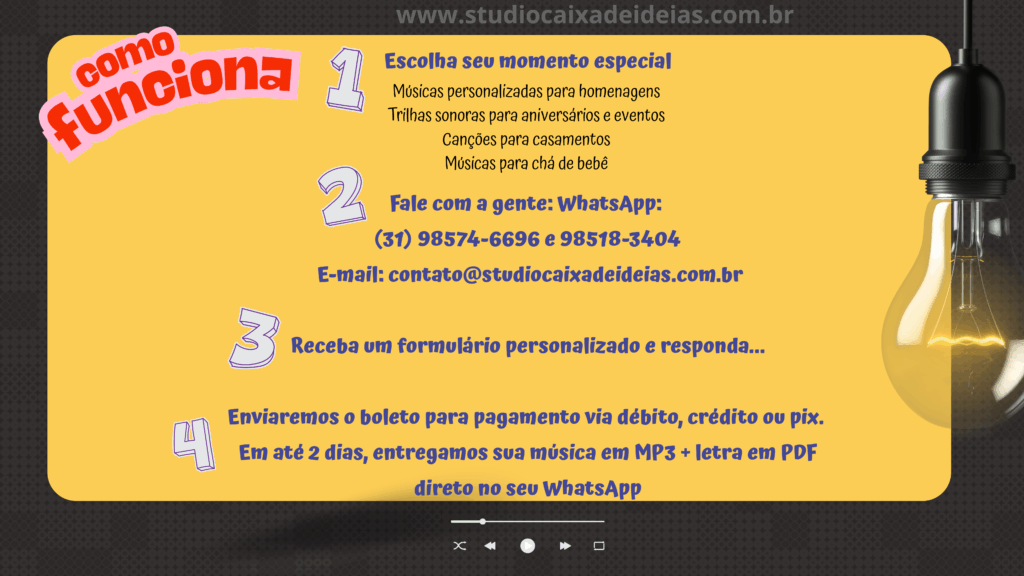 No Studio Caixa de Ideias, criamos trilhas personalizadas que capturam emoções e tornam momentos inesquecíveis. Nosso processo simples e ágil transforma suas histórias em músicas que falam ao coração.